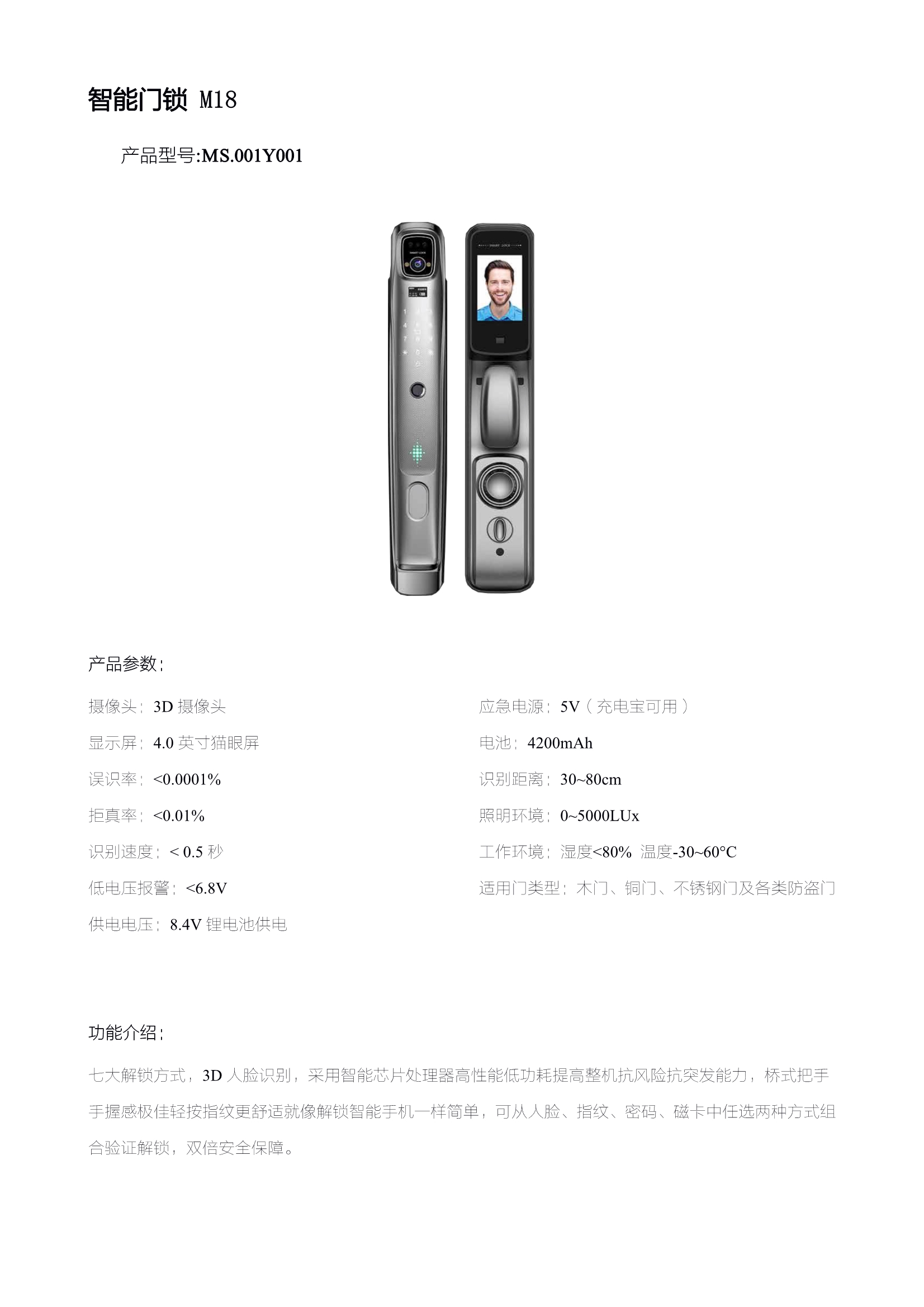 3D人臉快速識(shí)別 卓亞云智能門鎖M18