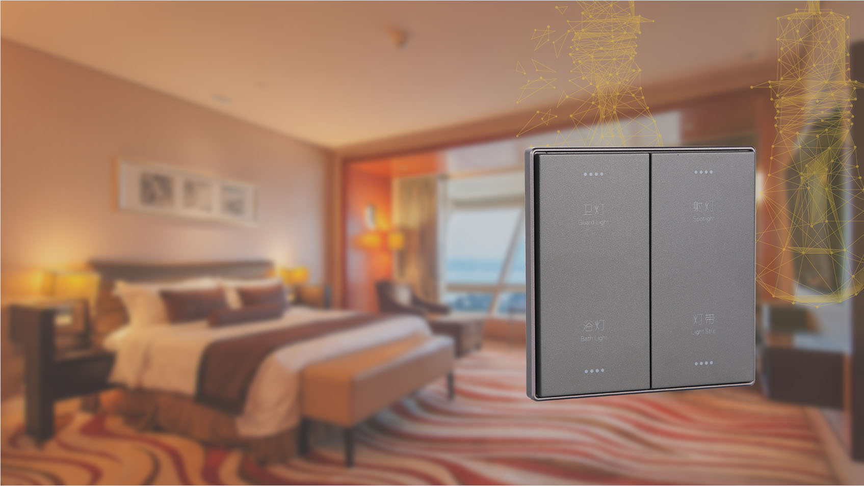 通過面板、照度感應器和無線設備端實現對燈具及窗簾的控制、自動感應和不同場景的切換,使賓客感到溫馨、愉悅的同時為酒店節能。